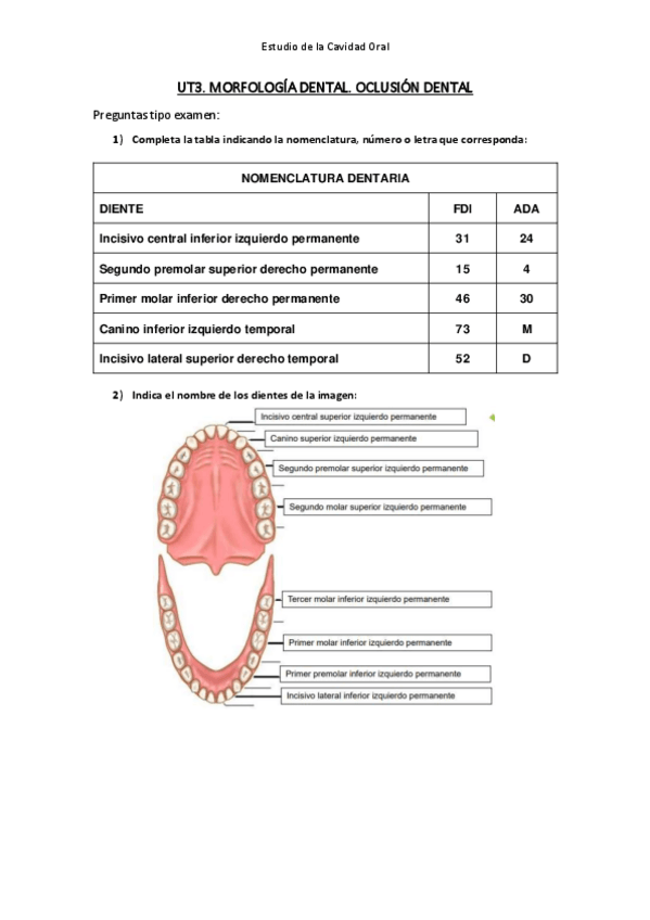 Preguntas de examen y actividades de la unidad 3 MORFOLOGÍA DENTAL y OCLUSIÓN DENTAL