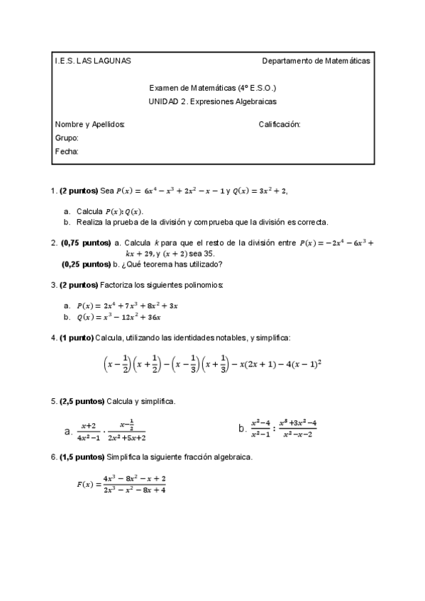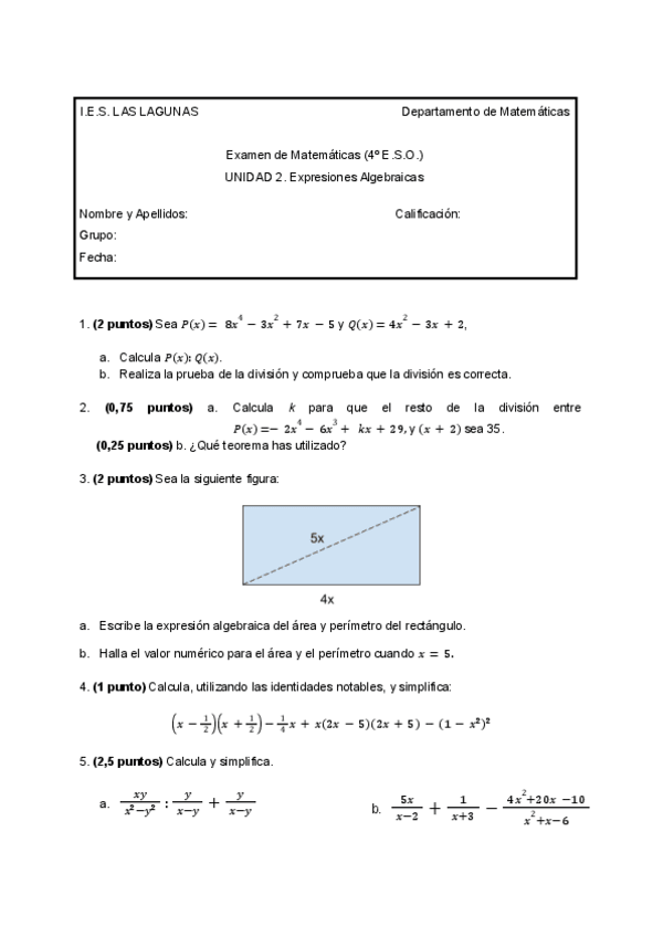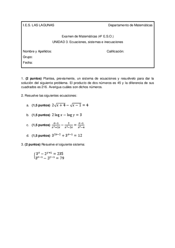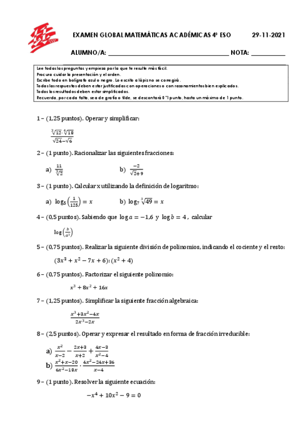 EXAMENES 4 ESO MATEMÁTICAS