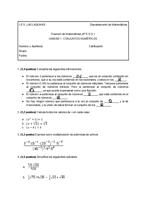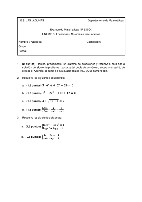 EXAMENES 4 ESO MATEMÁTICAS