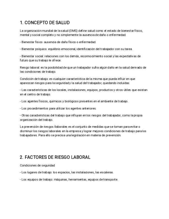 Tema 1 de la asigantura de FOL resumido. Puede ser usado como guía. La prvención de riesgos: Conceptos básicos 1- Concepto de salud 2- Factores de riesgo laboral 3- Daños a la salud del trabajador 4- Medidas de prevención y protección de riesgos laborale