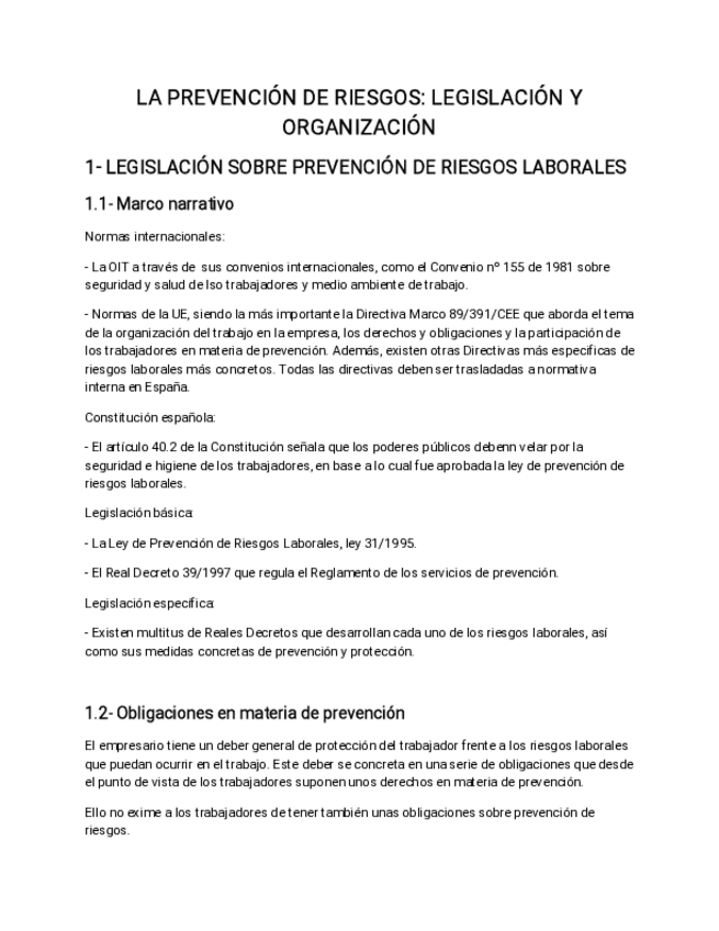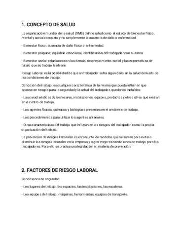 Tema 1 de la asigantura de FOL resumido. Puede ser usado como guía. La prvención de riesgos: Conceptos básicos 1- Concepto de salud 2- Factores de riesgo laboral 3- Daños a la salud del trabajador 4- Medidas de prevención y protección de riesgos laborale