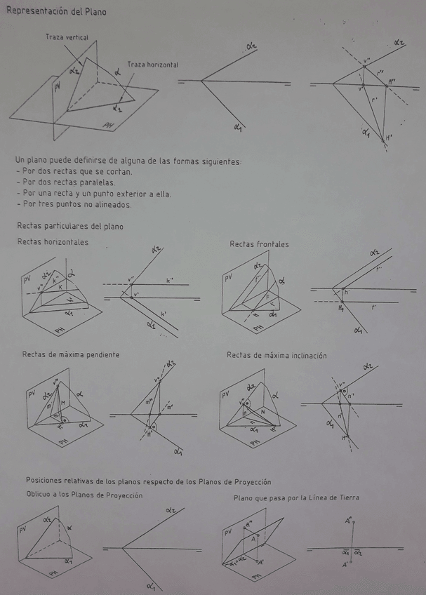 Representación del plano, rectas particulares del plano y posiciones relativas de los planos respecto de los planos de proyección