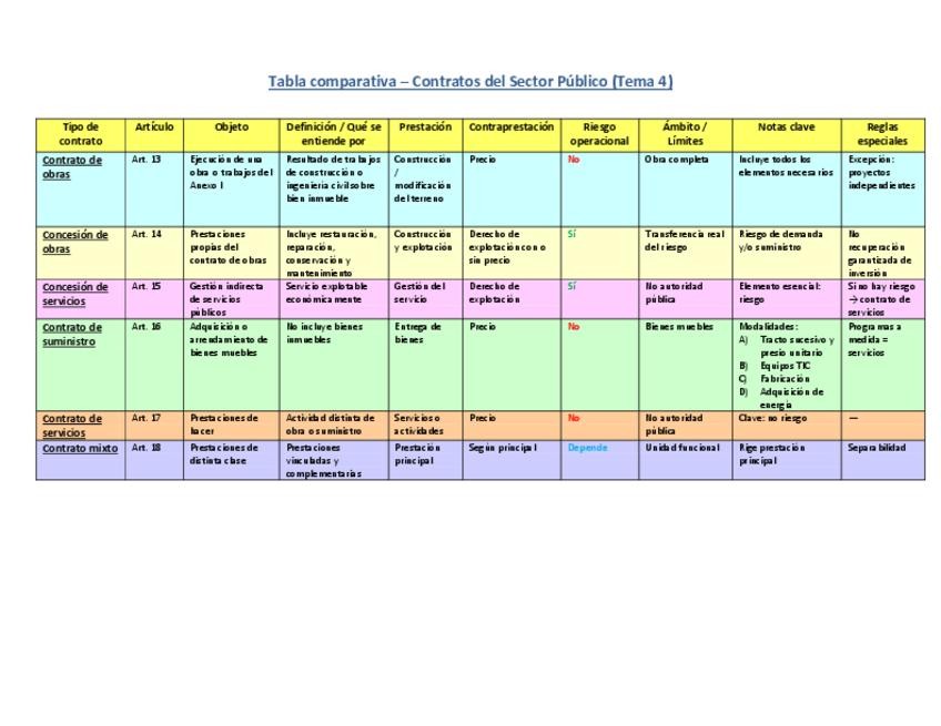 Tabla comparativa tipos de contratos del Sector público