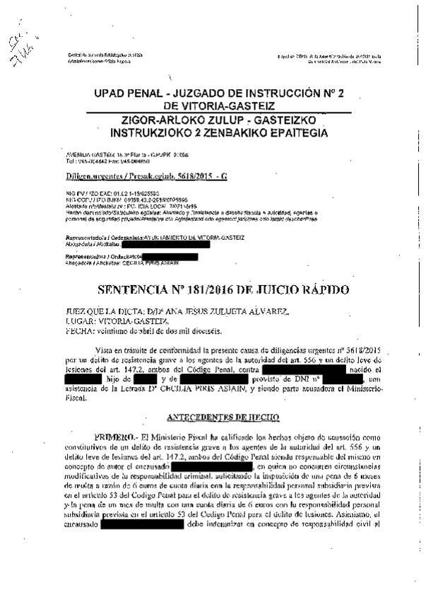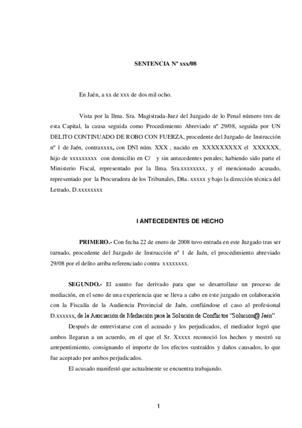 Os comparto un ejemplo de una Sentencia dictada en un procedimiento abreviado penal, en este caso por delito continuado de robo con fuerza.