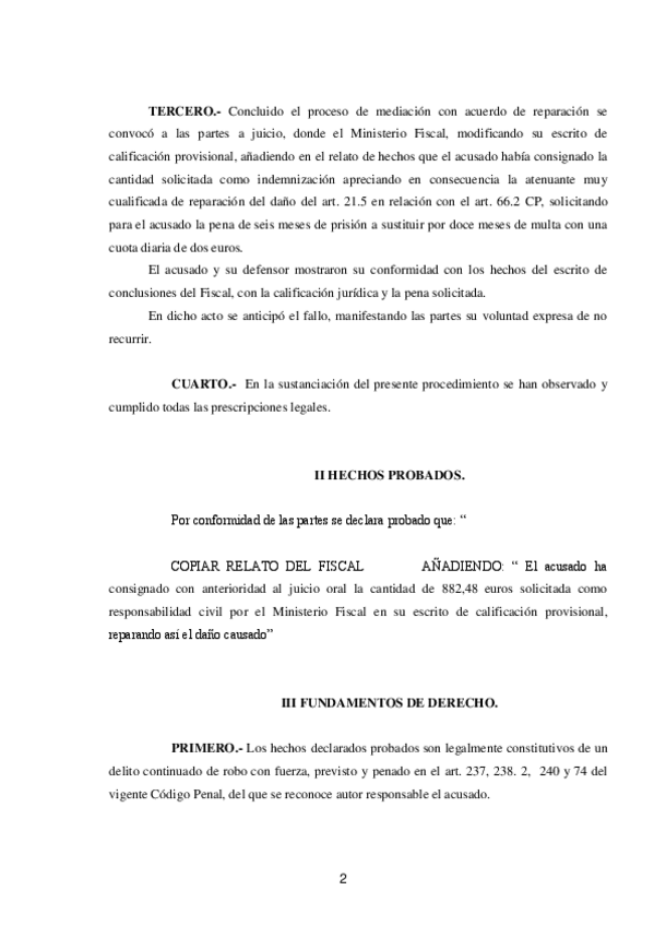 Aquí os subo un ejemplo de una sentencia de conformidad en el proced. de enjuiciamiento rápido para determinados delitos, también llamados JUICIOS RÁPIDOS. Corresponde al Tema 21 (según el BOE) Espero que os sirva de ayuda para tener una visión clara de