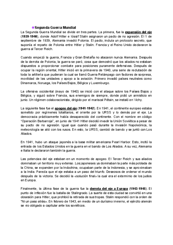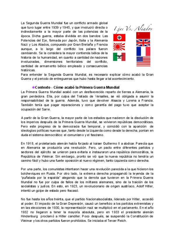 Resumen explicando el Contexto de la guerra, la Segunda Guerra Mundial y sus partes y Consecuencias.