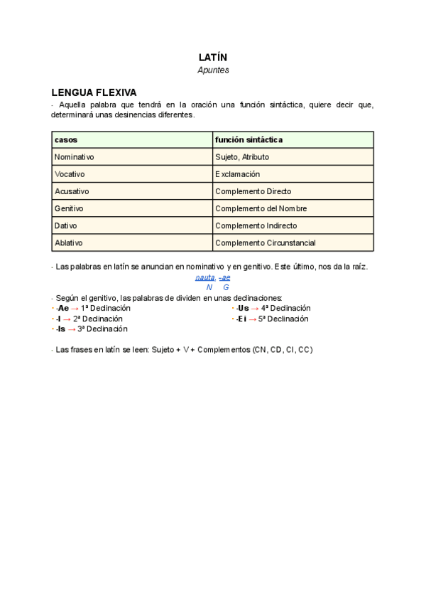 Apuntes sobre: Lengua Flexiva, Declinaciones, Verbos, Adjetivos y Preposiciones.