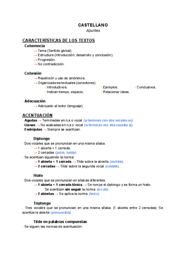 Apuntes sobre: Características de los Textos, Acentuación, Textos Orales y Semántica.