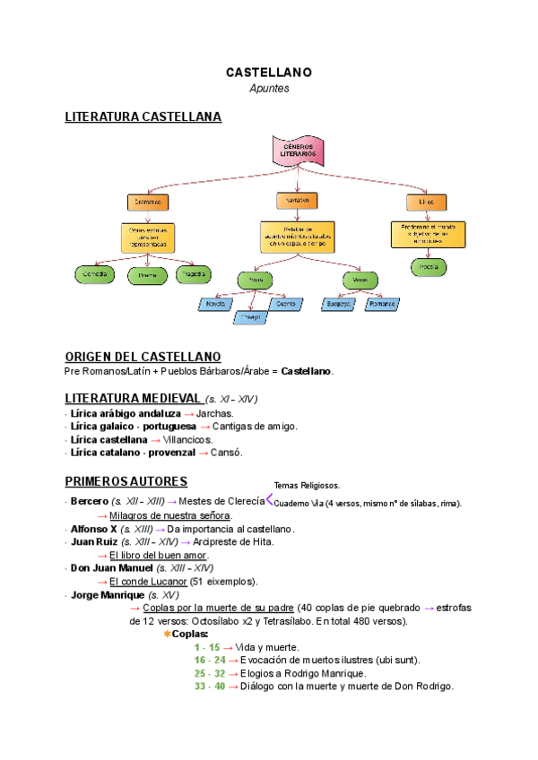 Apuntes sobre: Géneros literarios, Origen del castellano, Literatura Medieval, Primeros autores, Cantar del Mio Cid.