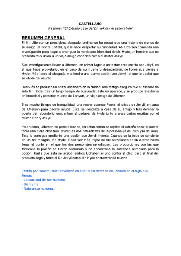 Resumen General, por Capítulos y los Personajes de “El Extraño caso del Dr. Jeckyll y el señor Hyde” de Robert Louis Stevenson.