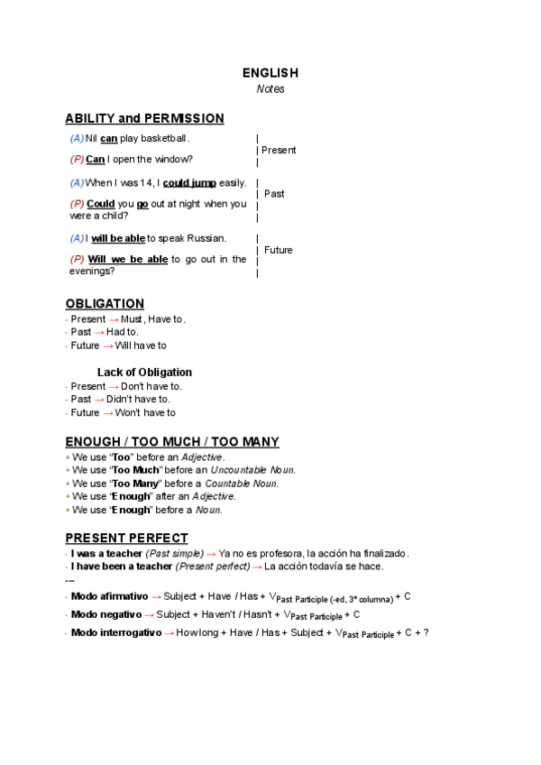 Apuntes sobre: Ability and Permission, Obligation, Enough, Too Much, Too Many, Present Perfect, Yet, Still, Already and Just.