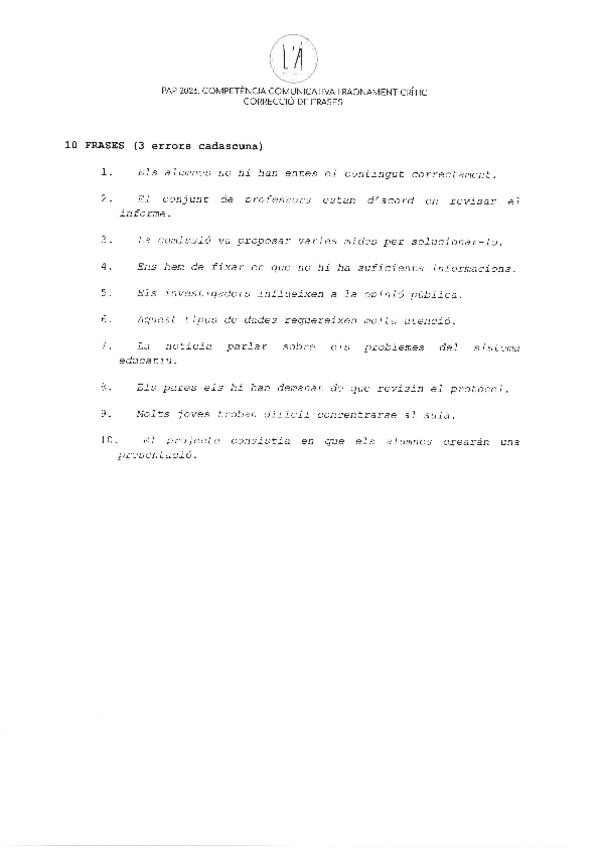 Exercicis de correcció d'erros en frases. Hi ha les correccions al darrera