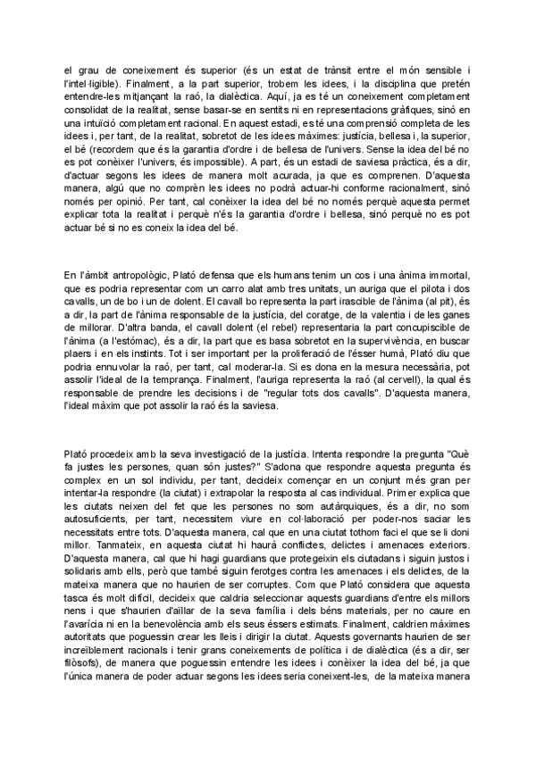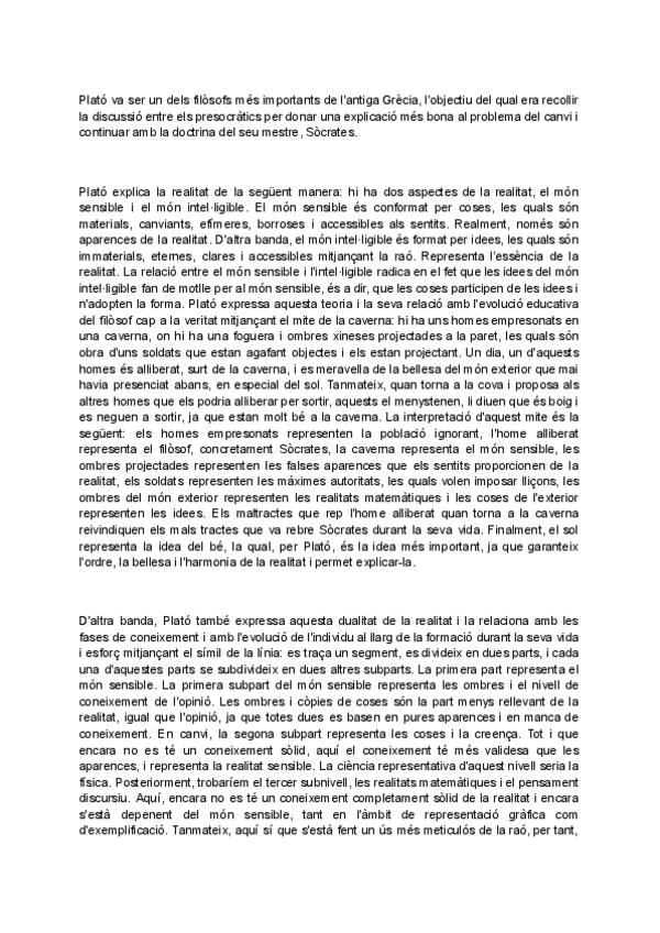 Aquí s'hi pot trobar un resum complet, breu i ben redactat de la doctrina filosòfica de Plató, amb tots els coneixements necessaris per selectivitat, elaborat a partir de l'assistència a classe, de vídeos i dels propis textos de Plató. Vaig treure un 10 a