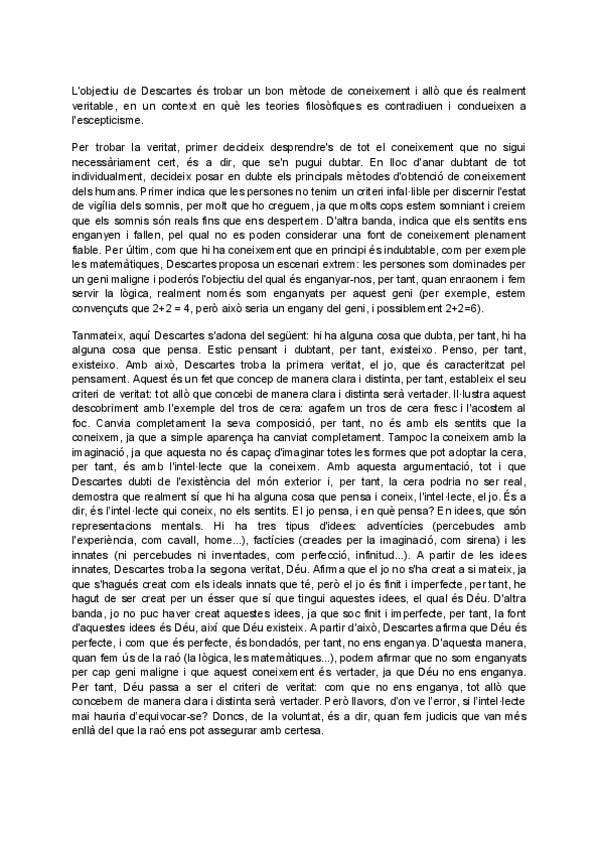 Aquí s'hi pot trobar un resum complet, breu i ben redactat de la doctrina filosòfica de Descartes, amb tots els coneixements necessaris per selectivitat, elaborat a partir de l'assistència a classe, de vídeos i dels propis textos de Plató. Vaig treure un