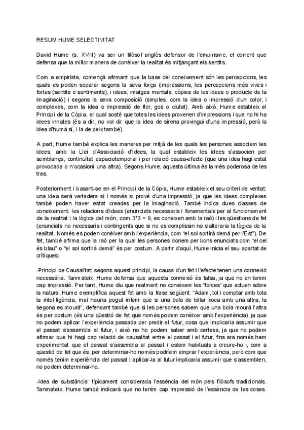 Aquí s'hi pot trobar un resum complet, breu i ben redactat de la doctrina filosòfica de Hume, amb tots els coneixements necessaris per selectivitat, elaborat a partir de l'assistència a classe, de vídeos i dels propis textos de Plató. Vaig treure un 10 a