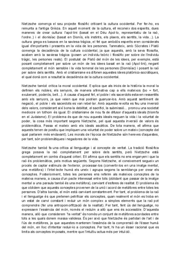 Aquí s'hi pot trobar un resum complet, breu i ben redactat de la doctrina filosòfica de Nietzsche, amb tots els coneixements necessaris per selectivitat, elaborat a partir de l'assistència a classe, de vídeos i dels propis textos de Plató. Vaig treure un