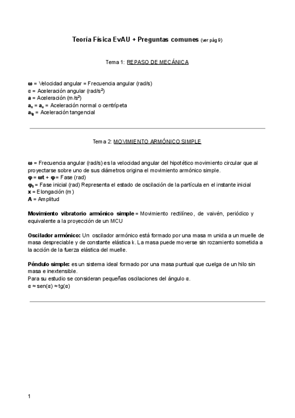 Incluye: Mecánica, Movimiento armónico simple, movimiento ondulatorio, óptica física, óptica geométrica, campo gravitatorio y campo eléctrico.