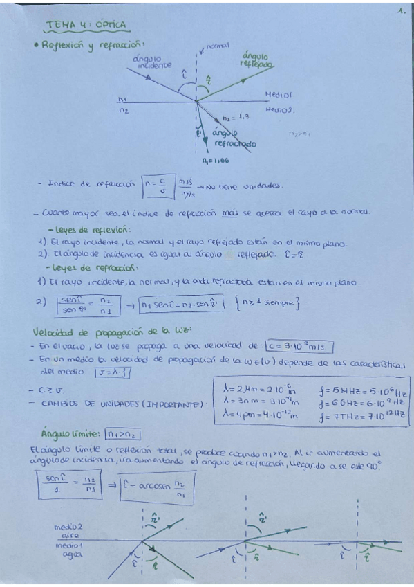 Tema 5: Óptica y refracción. El pdf contiene toda la teoria del tema, formularios de formulas y ejercicios de selectividad del tema.