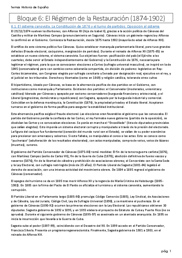 Nuevo Bloque 6 (El régimen de la Restauración. 1874-1902) resumido a menos de 50 líneas