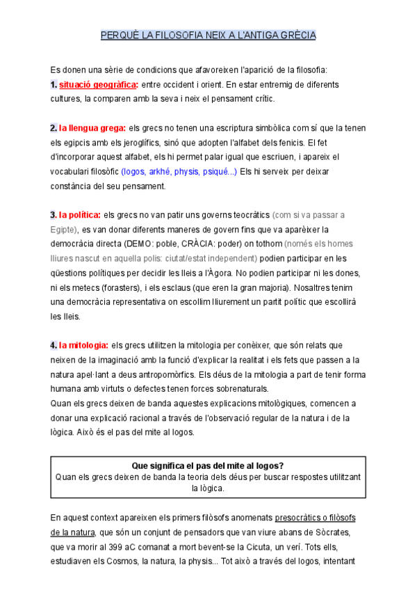 Per que neix la fiolosofia a l'antiga Grècia; pitagòrics; l'escola d'Efes, l'escola d'Elea, l'escola pluralista; els Sofistes y Socrátes