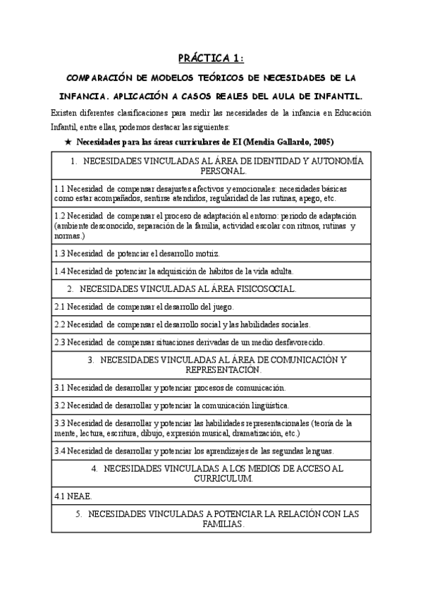 primera practica bienestar psicológico infantil. COMPARACIÓN DE MODELOS TEÓRICOS DE NECESIDADES DE LA INFANCIA. APLICACIÓN A CASOS REALES DEL AULA DE INFANTIL.