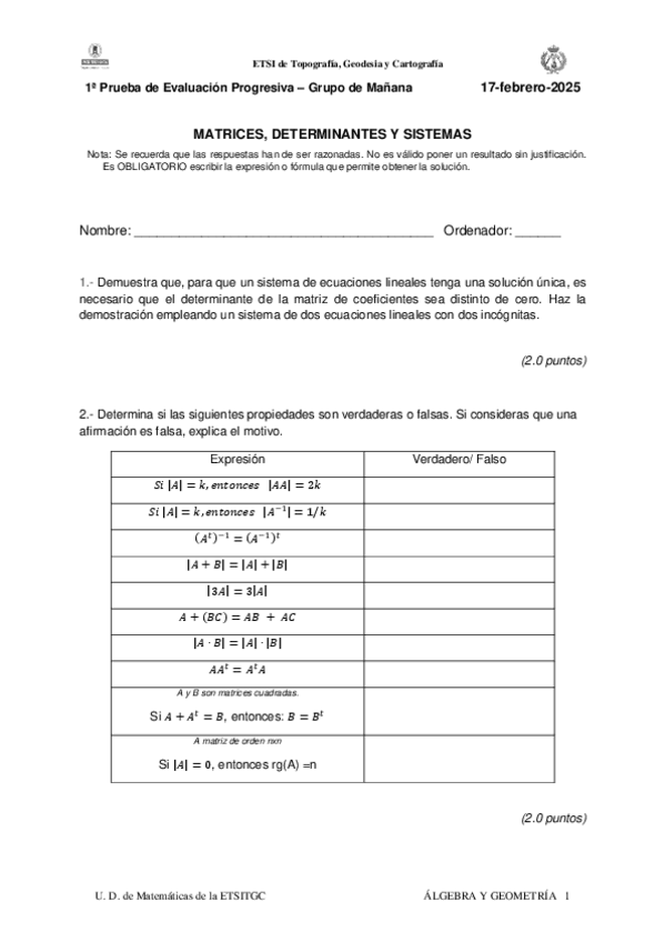Tercer Examen Grupo tarde 24/25. Tema ESPACIO VECTORIAL Y APLICACIONES LINEALES