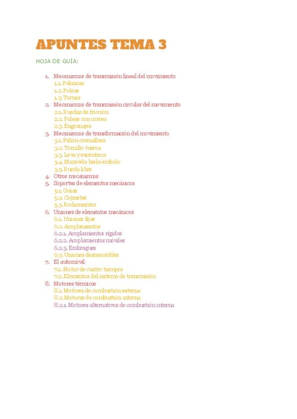 En este documento hay un resumen sobre Sistemas Mecánicos y Motores de 1ºBACH. Es un resumen bastante completo en el que podrás estudiar este temario. La primera página es un índice de los apuntes donde podréis ver los puntos del tema.