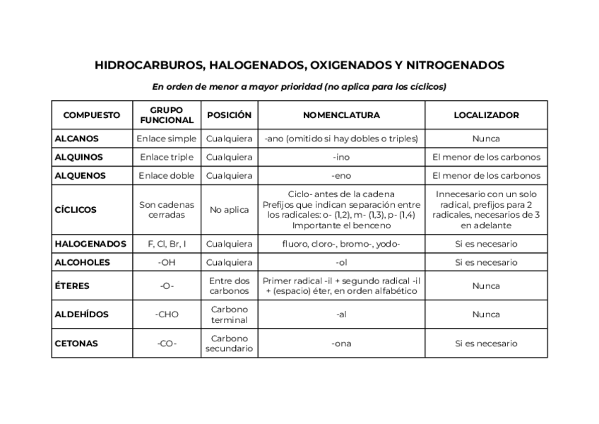 Tabla resumen de los grupos funcionales más comunes en la formulación orgánica de 1º.