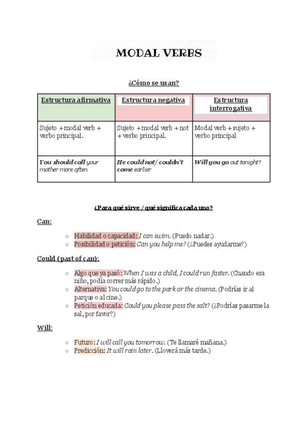 He subido un esquema bastante visual a modo de tablita de Inglés con todos los modal verbs!. Este sirve tanto para 1 de bachillerato como para 2 de bachillerato, pero sobre todo lo recomiendo para preparárselo de cara a la PAU. Creo que está genial, te l
