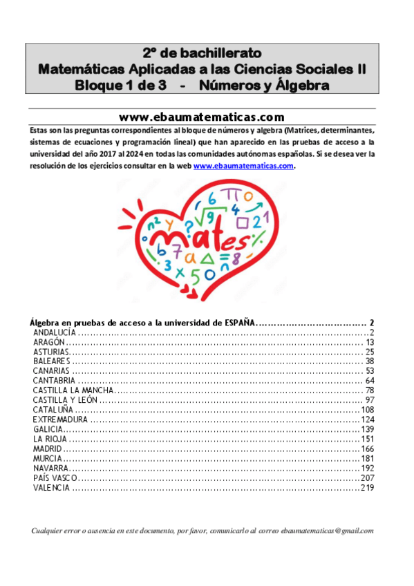 He subido nuevos archivos que contienen todos los tipos de ejercicios que pueden entrar en la PAU de CUALQUIER COMUNIDAD AUTÓNOMA de Matemáticas Aplicadas a las CCSS. Estos ejercicios sirven tanto para prepararse los exámenes como para practicar y prepara