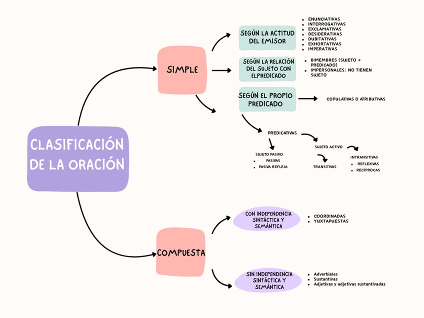 Mapa conceptual de sintaxis: oraciones simples y compuestas y sus tipos.