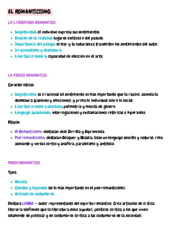 Resumen de Lengua Castellana y Literatura del Romanticismo. Subrayado con colores y muy bien resumido y explicado.