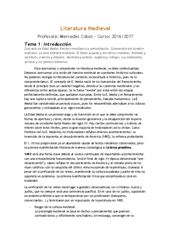 He publicado nuevos apuntes de 1º Literatura Española Medieval: Tema 1. Introducción. - Lit. Medieval Española.docx