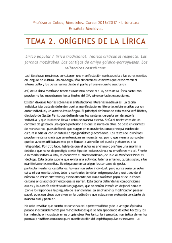 He publicado nuevos apuntes de 1º Literatura Española Medieval: Tema 2. Orígenes de la lírica. - Lit. Esp. Medieval.docx