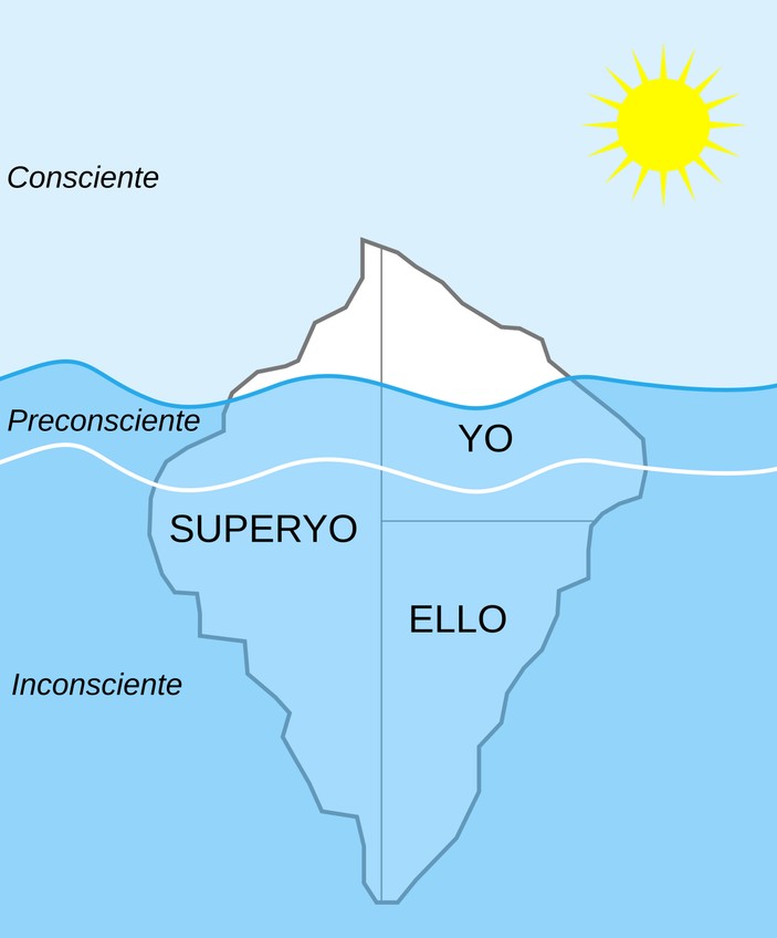La imagen representa el modelo del iceberg de Freud sobre la mente humana. La parte visible del iceberg corresponde al consciente, donde están los pensamientos y percepciones actuales. Bajo la superficie se ubica el preconsciente, con contenidos que puede