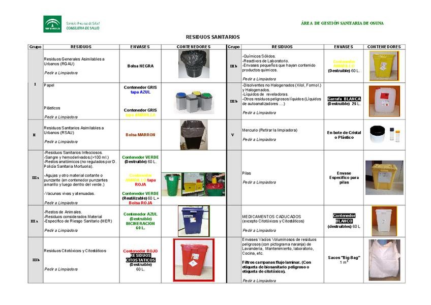 En este documento, encontrarás una tabla organizada sobre los Residuos Sanitarios del Sistema Andaluz de Salud (SAS), que permite visualizar de forma clara y completa su clasificación, manejo y correcta disposición para facilitar su comprensión y aplicaci