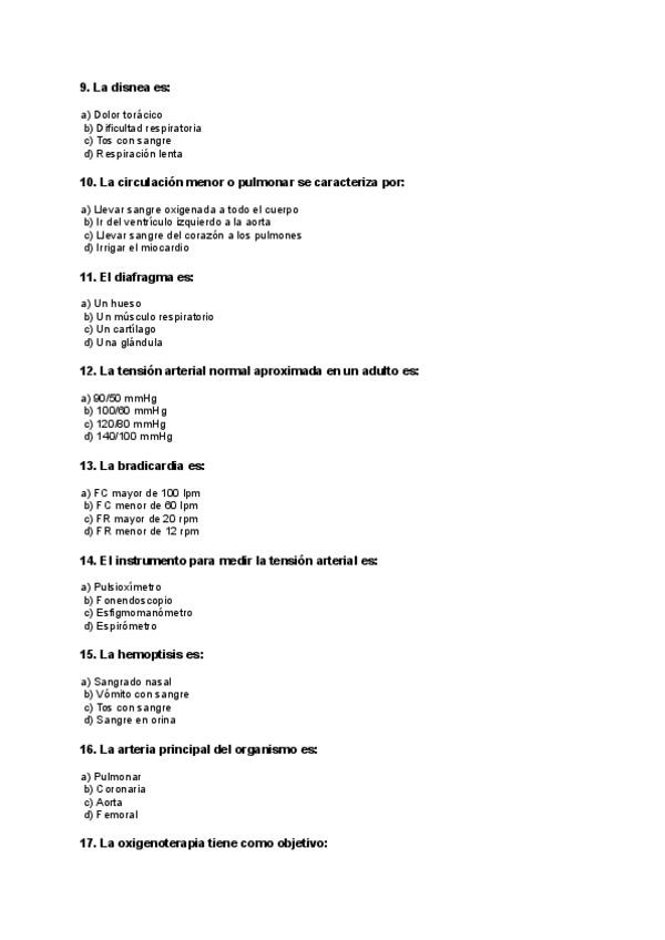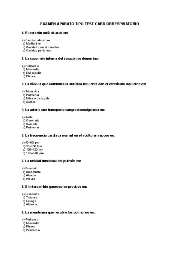 En este documento encontrarás un examen tipo test del aparato cardiorrespiratorio, compuesto por 30 preguntas con cuatro opciones de respuesta cada una. Al final del examen se incluye la plantilla de soluciones para facilitar la corrección y el autoestudi