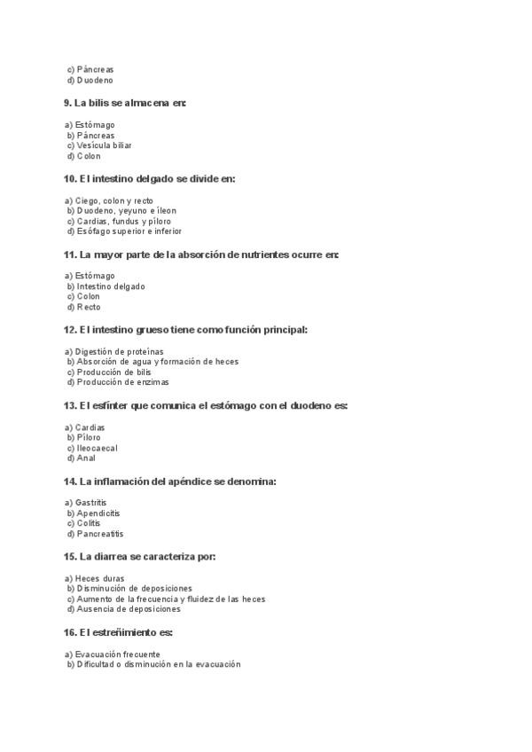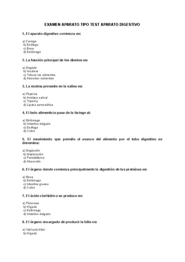 En este documento encontrarás un examen tipo test del aparato digestivo, compuesto por 30 preguntas de respuesta cada una. Al final del examen se incluye la plantilla de soluciones para facilitar la corrección y el autoestudio.