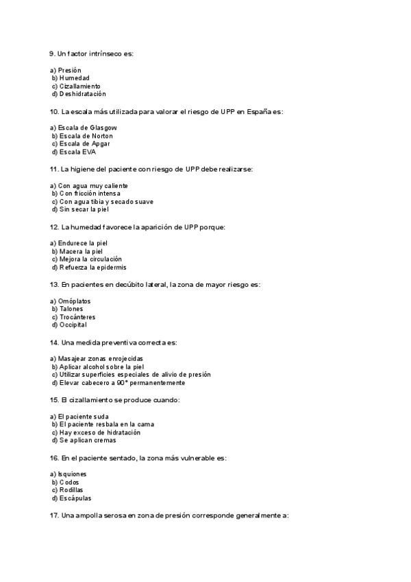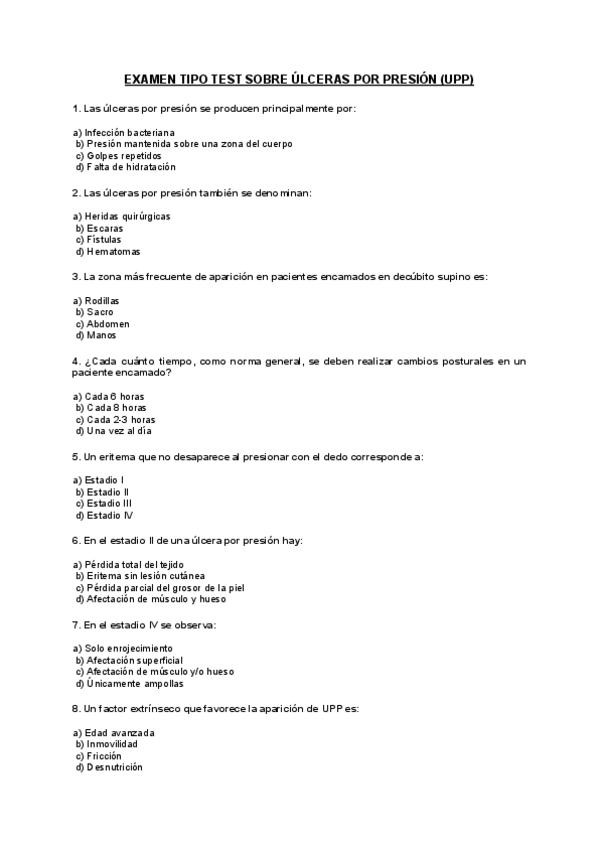 En este documento, encontrarás un examen de 30 preguntas sobre úlceras por presión (UPP) formato Tipo Test. Además, puedes comprobar tus soluciones al final del documento. ¡Buena suerte y ánimo!