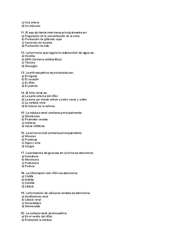 En este documento, encontrarás un examen sobre el aparato urinario dividido en dos partes. La primera parte consta de 30 preguntas tipo test y la segunda trata de 10 preguntas de desarrollo. ¡Buena suerte! Ánimo.