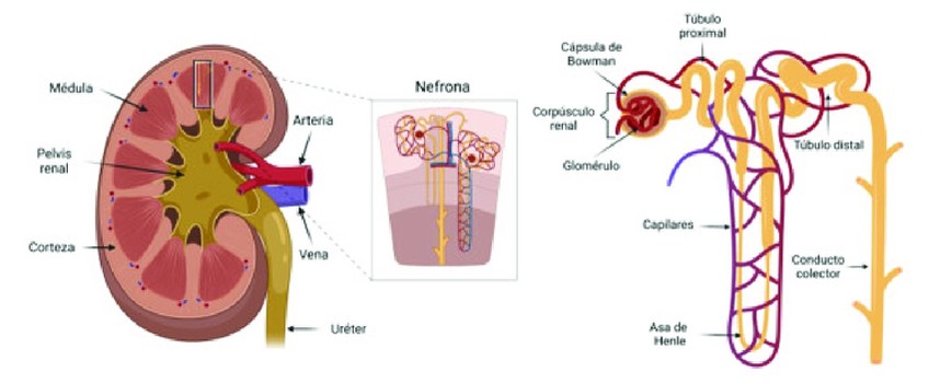 La imagen muestra la anatomía del riñón y un esquema ampliado de la nefrona. A la izquierda se observan médula, corteza, pelvis renal, arteria, vena y uréter. A la derecha se detalla la nefrona: glomérulo dentro de la cápsula de Bowman, túbulo proximal, a