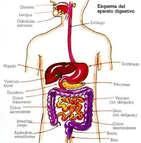 La imagen presenta un esquema del aparato digestivo humano. Se identifican estructuras como dientes, lengua y glándulas salivales en la boca; el esófago que conduce el alimento al estómago; y órganos anexos como hígado, vesícula biliar y páncreas. También
