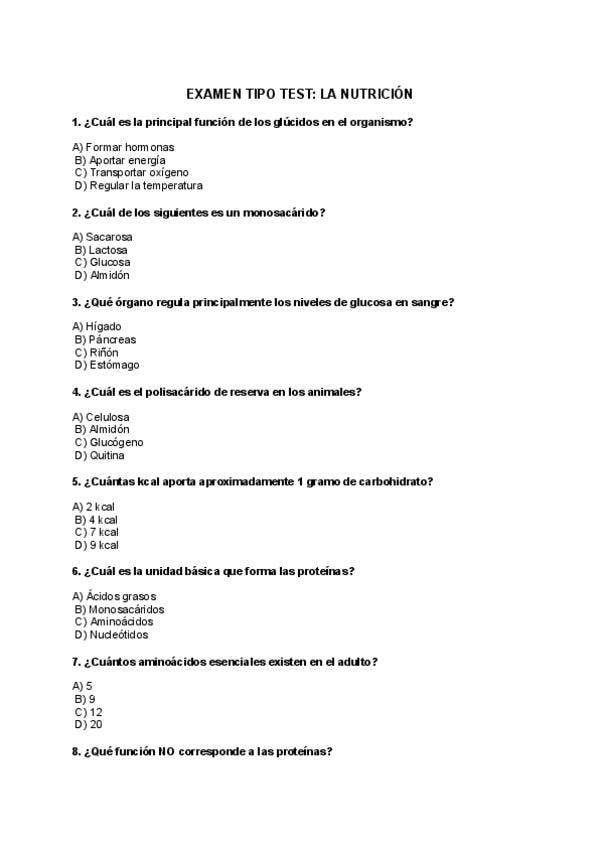 En este documento encontrarás un examen tipo test de 30 preguntas para que puedas prepararte en el tema de Nutrición. Además, contiene cada una de las respuestas. ¡Ánimo!