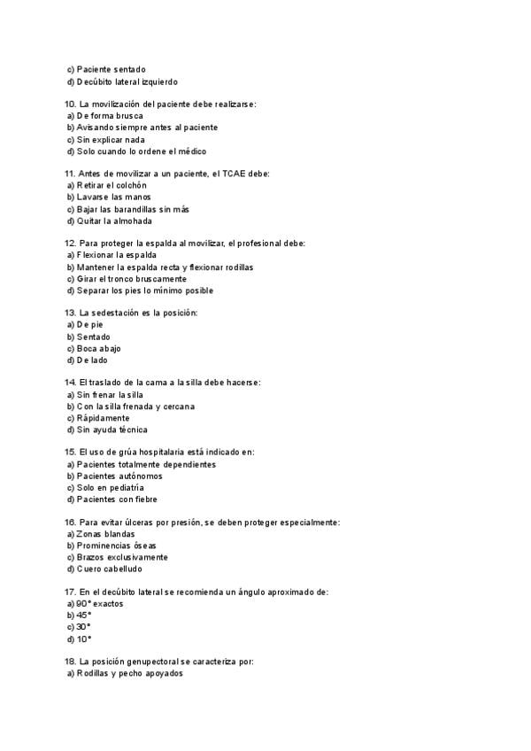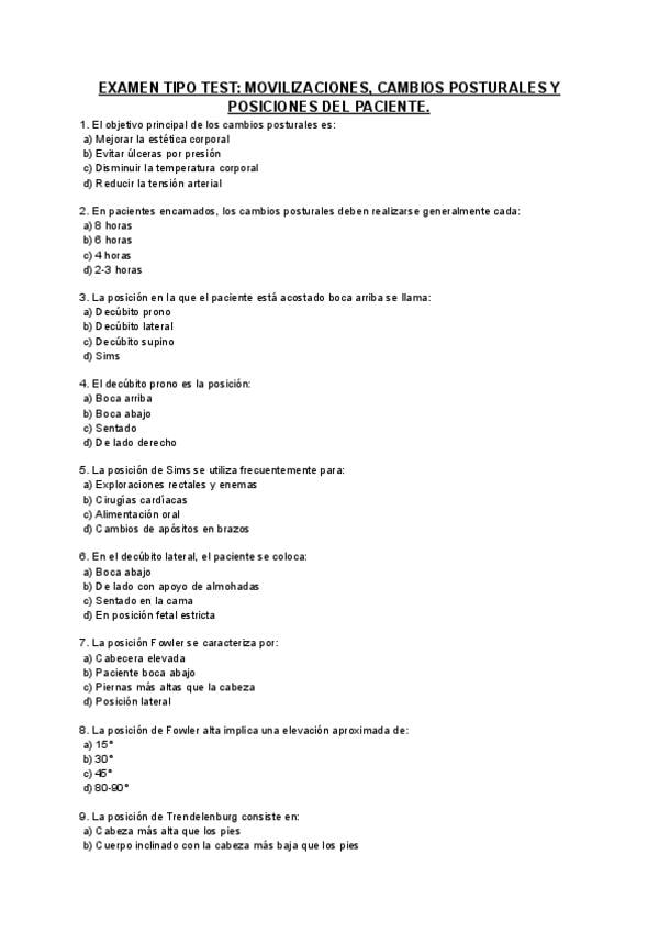En este documento encontrarás un examen tipo test de 30 preguntas sobre Posiciones, Movilizaciones y Cambios Posturales de pacientes. Además, incluye sus respuestas. Mucha suerte, ánimo.