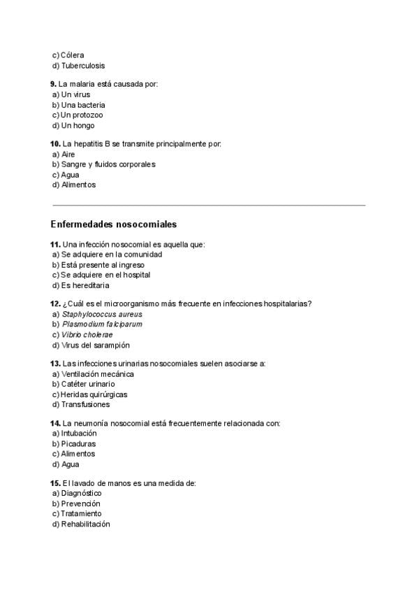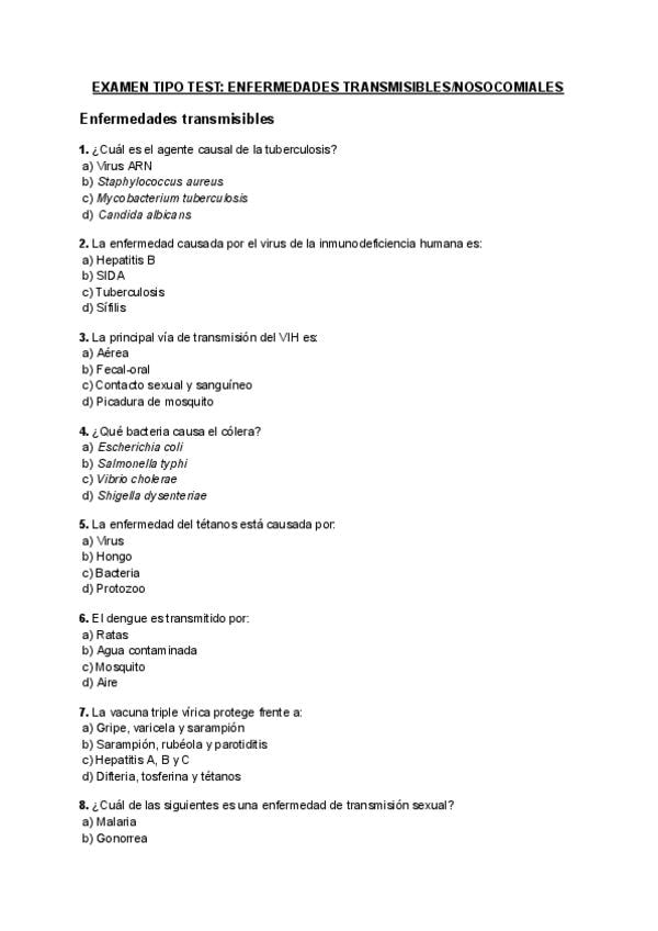 En este documento encontrarás un Examen tipo test de 40 pregutas: ENFERMEDADES TRANSMISIBLES/NOSOCOMIALES con soluciones. Además, contiene 10 preguntas teóricas. ¡Ánimo!