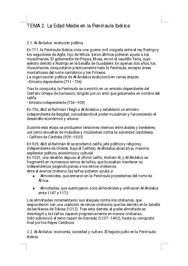 Estos apuntes del Tema 2 — La Edad Media en la Península Ibérica ofrecen un resumen sencillo de estudiar, diseñado específicamente para la preparación de la PAU. Encontrarás explicaciones claras de Al-Ándalus, la evolución de los reinos cristianos, los mo