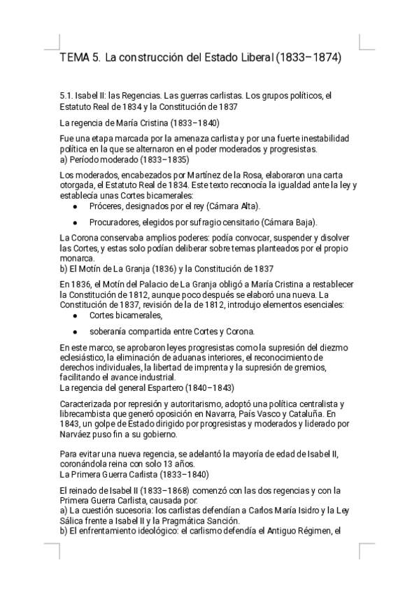 Estos apuntes del Tema 5 — La construcción del Estado Liberal ofrecen un resumen riguroso, visual y sencillo de estudiar, diseñado específicamente para la preparación de la PAU. Encontrarás explicaciones claras de las regencias, guerras carlistas, constit