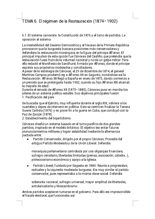 Estos apuntes del Tema 6 - El régimen de la Restauración ofrecen un resumen riguroso, visual y sencillo de estudiar, diseñado específicamente para la preparación de la PAU. Encontrarás explicaciones claras del sistema canovista, el turnismo, el papel del