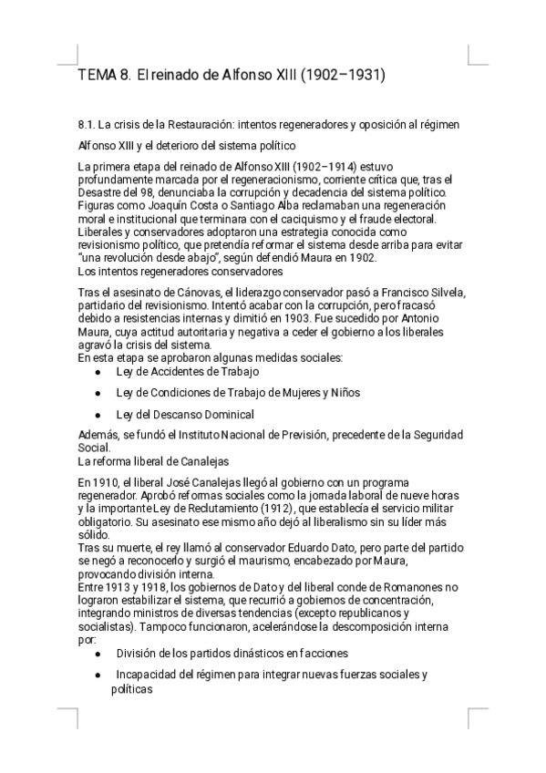 Estos apuntes del Tema 8 — El reinado de Alfonso XIII ofrecen un resumen riguroso, visual y sencillo de estudiar, diseñado específicamente para la preparación de la PAU. Encontrarás explicaciones claras de la crisis de la Restauración, el regeneracionismo