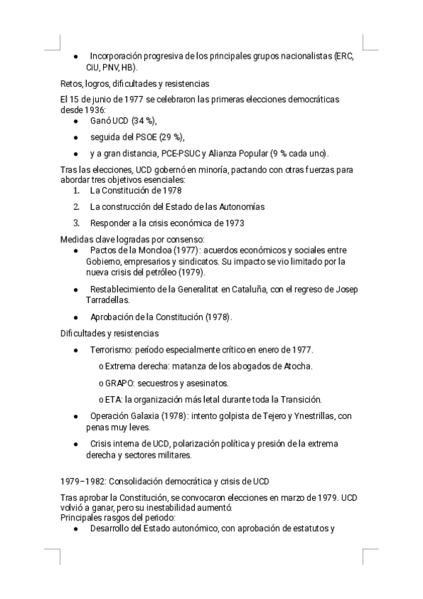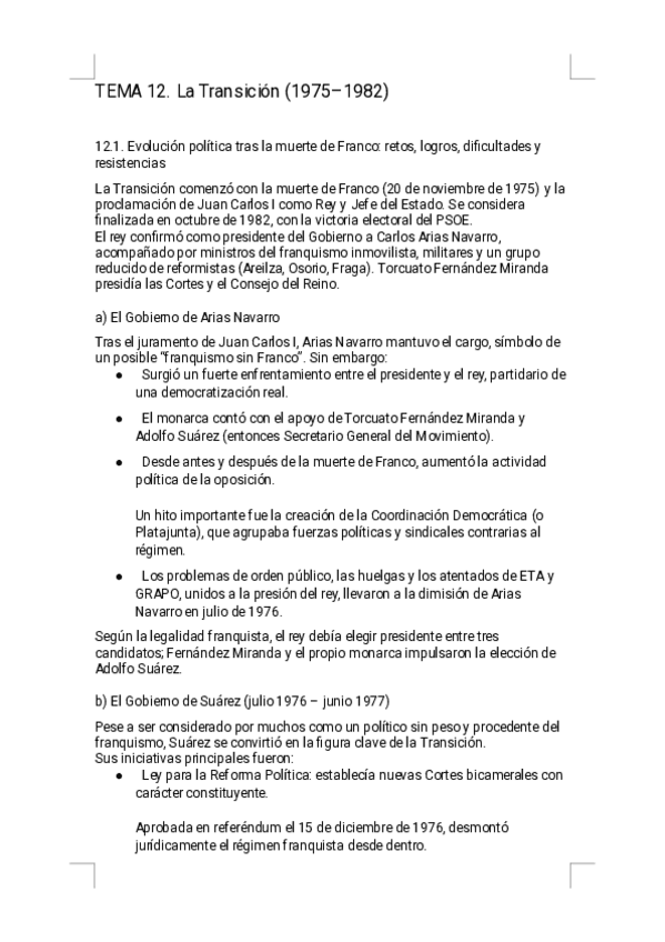 Estos apuntes del Tema 12 - La Transición a la democracia ofrecen un resumen riguroso, visual y sencillo de estudiar, diseñado específicamente para la preparación de la PAU. Encontrarás explicaciones claras de los gobiernos de Arias Navarro y Suárez, la L